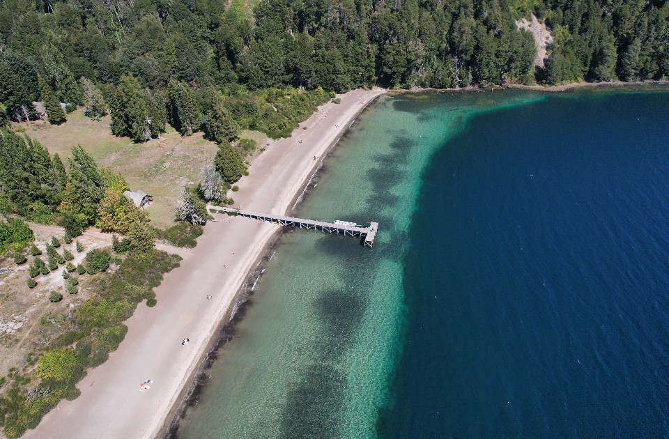 Luego de la cascada, apenas reiniciada la marcha vas a encontrar toda la imponencia del lago Falkner, con sus bellas playas de arena y el pequeño río que lo hermana con el lago Villarino.